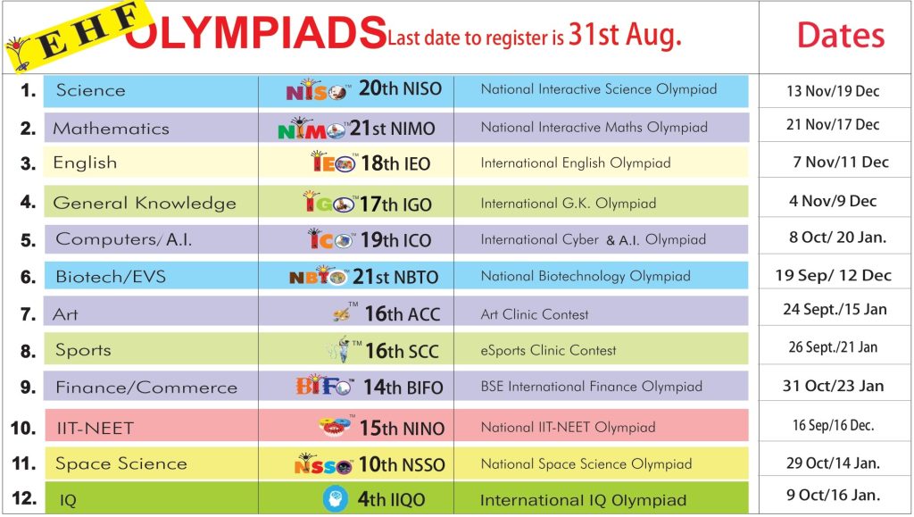 | 2) Olympiads(Subjects), their Mode of Conduction and TEST Dates No Change in Dates will be allowed. Online Test will conducted on a fixed date(s) selected by the school on EHF Exam Server. The dates will be based on schools I.T. infrastructure. Each student will get unique Q.P. Classes 1-3 students can answer on QP itself. No OMR will be sent. |